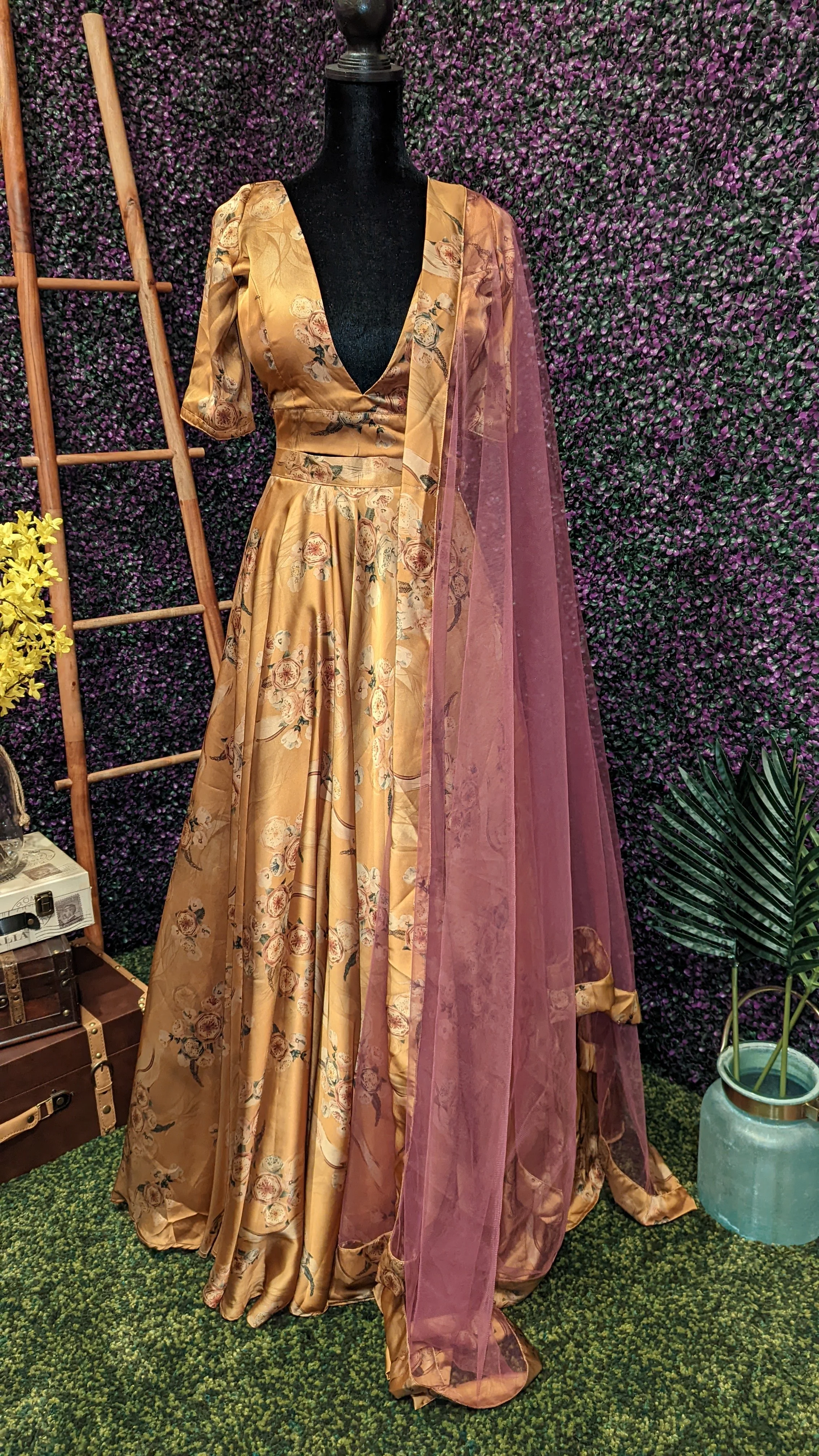 Dazzle in this rose gold printed silk lehenga, an ideal choice for destination weddings and wedding events, offering a simple yet fun and chic look suitable for any occasion.