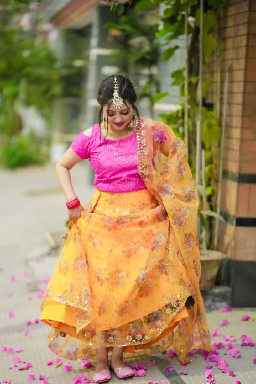 Adorn yourself with style in this mustard yellow floral georgette lehenga paired with a green blouse, a harmonious color choice perfect for gaye holud/haldi or mehndi events, destination weddings, and outdoor wedding celebrations.