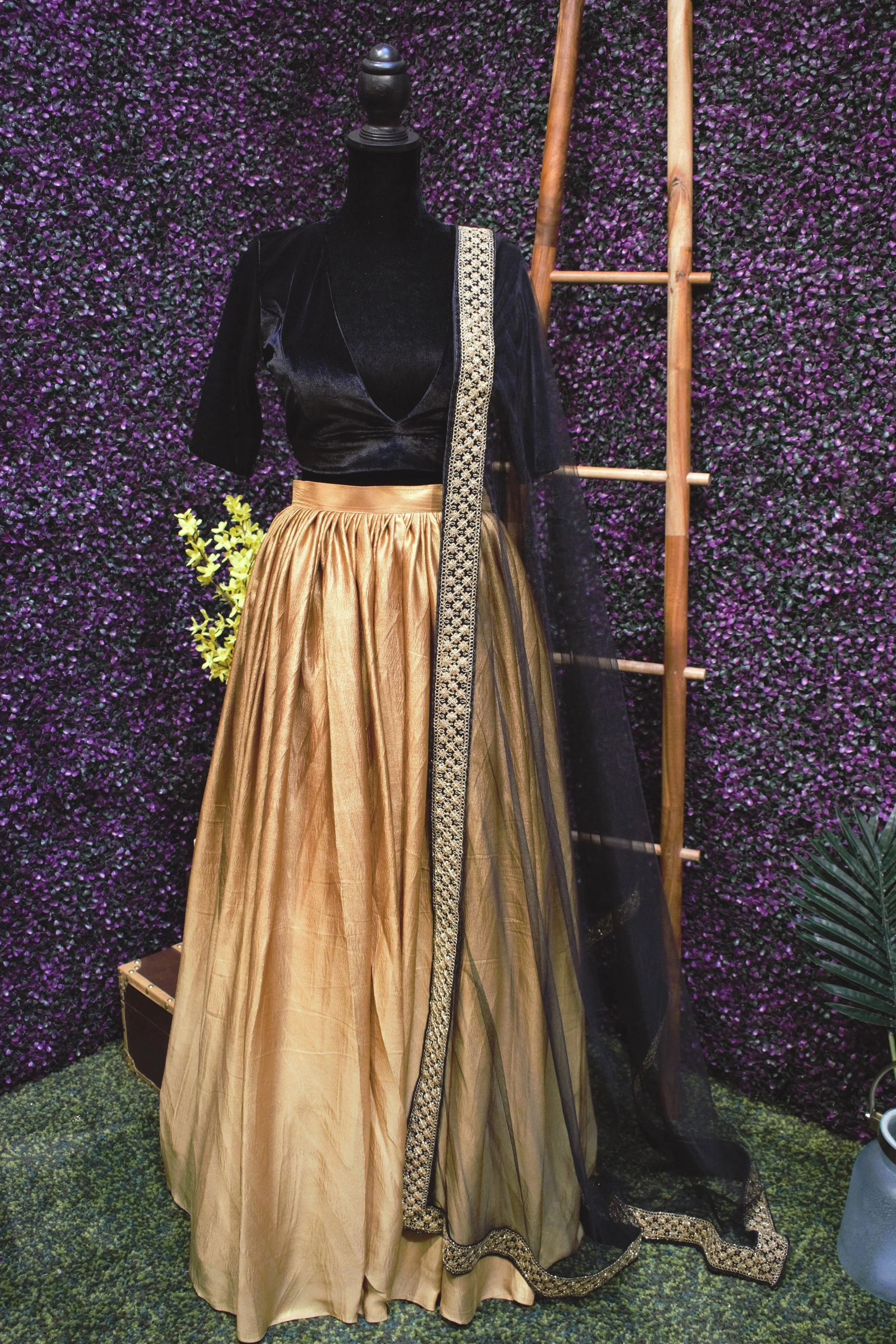 Make a statement with this chic gold and black lehenga, perfect for wedding events and special occasions, including destination weddings, where the elegance of simplicity speaks volumes, catering to both wedding guests and brides during pre-wedding celebrations.